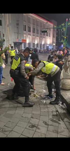 Yogyakarta — Personel Polresta Yogyakarta melakukan pembersihan sampah usai pengamanan malam pergantian tahun di kawasan Titik Nol Kilometer Yogyakarta, Kamis (1/1/2026) dini hari. Aksi tersebut terekam dan mendapat perhatian luas masyarakat. 01/01/25