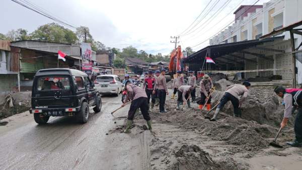Kegiatan pembersihan berlangsung di wilayah Kecamatan Wih Pesam, Kabupaten Bener Meriah, Jumat (9/1/2026). Dipimpin langsung oleh Kasat Samapta Polres Bener Meriah IPTU Zulkarnel, personel gabungan bahu-membahu membersihkan material sisa bencana berupa lumpur, bebatuan, dan kayu yang menutupi badan jalan.