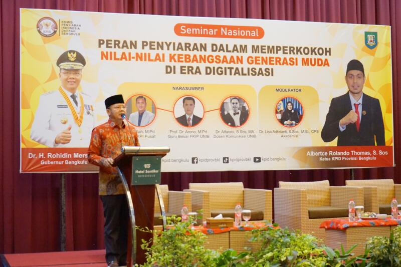 Siaran itu sumber daya. Pada era digitalisasi ini kita semua bisa menjadi penyiar dan melakukan siaran. Jadi apa yang dibutuhkan? Tentunya membangun karakter dan pola pikir dalam sebuah konsep keilmuan,” kata Gubernur Rohidin, saat membuka seminar nasional dengan tema Peran Penyiaran Dalam Memperkokoh Nilai-Nilai Kebangsaan Generasi Muda di Era Digitalisasi, bertempat di Hotel Santika, Selasa (4/6/2024).