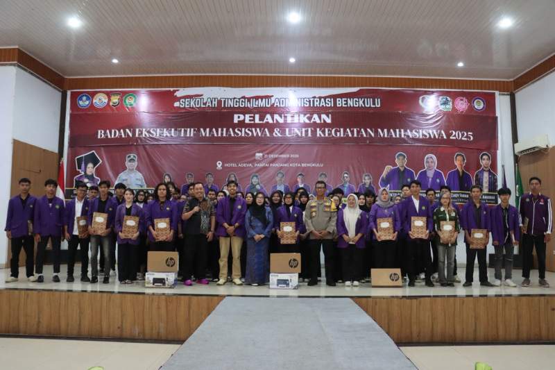 Kapolresta Bengkulu Kombes Pol Sudarno, S.Sos., M.H menghadiri kegiatan Pelantikan Badan Eksekutif Mahasiswa (BEM) dan Unit Kegiatan Mahasiswa (UKM) Sekolah Tinggi Ilmu Administrasi (STIA) Bengkulu Tahun 2025 yang dilaksanakan di Hotel Adeva Bengkulu. 21/12.