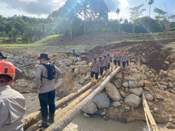 Dalam kegiatan tersebut, personel Brimob bergotong royong mengangkut kayu serta material dasar untuk membangun jembatan darurat. Jembatan ini sangat dibutuhkan masyarakat setempat karena menjadi akses utama penghubung antar desa yang sempat terputus akibat bencana.