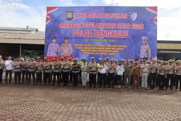 Wakapolda Bengkulu, Brigjen Pol Dicky Sondani, S.I.K., M.H., memimpin apel gelar pasukan Operasi Keselamatan Nala 2026 di Lapangan Anton Soedjarwo Polda Bengkulu. 02/02.